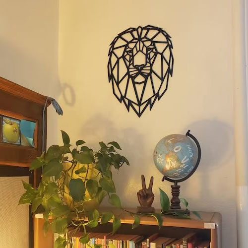 Cuadro León Geométrico, fabricado en MDF 3mm pintado negro, cuenta con un gancho para colgar, dimensiones aproximadas 39 x 39 cms.